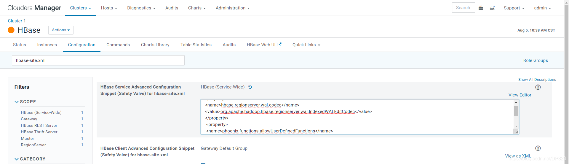 添加属性,选择“Hbase”->“配置”,搜索“hbase-site.xml 的 HBase 服务高级配置代码段”,单击“以XML格式查看”,并添加以下属性: