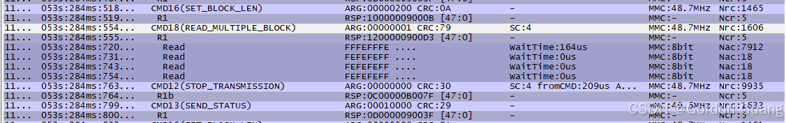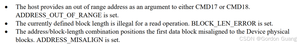 Multiple read主要用CMD18 (READ_MULTIPLE_BLOCK)。CMD18带的参数就是read的起始地址,数据大小由host决定。有两种方式决定数据大小:1、CMD18前用CMD23设定要read的block数量 2、read的过程中,用CMD12来进行中断,也可以知道此read的block数量。
