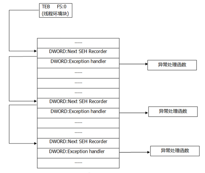 每个SEH包含两个DWORD指针:SEH链表指针和异常处理函数句柄, 共8个字节。SEH链表结构图如下图所示。