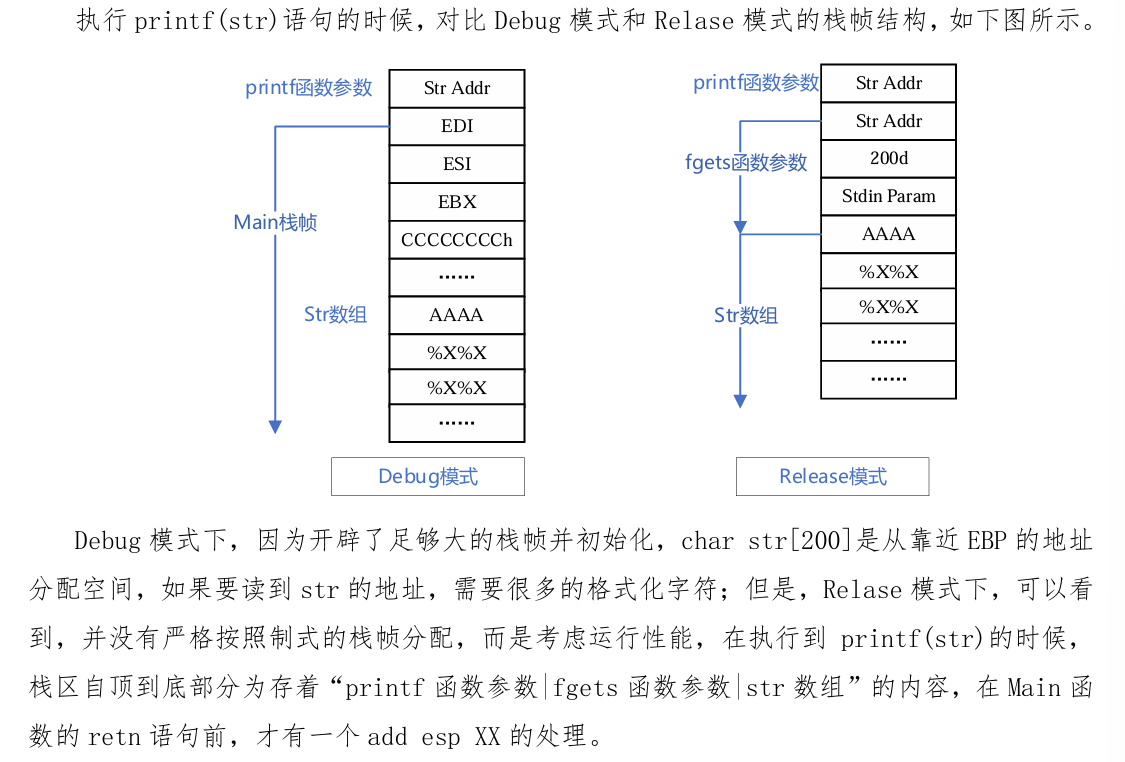 void formatstring_func1(char *buf) { char mark[] = “ABCD”; printf(buf); }调用时如果传入”%x%x…%x”,则 printf 会打印出堆栈中的内容,不断增加%x 的个数 会逐渐显示堆栈中高地址的数据,从而导致堆栈中的数据泄漏。