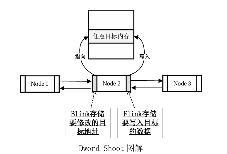 Dword Shoot 攻击:通过堆溢出覆写了一个空闲堆块的块首的前向指针 flink 和后向指针 blink,我们可以精心构造一个地址和一个数据,当这个空闲堆块从链表里卸下 的时候,就获得一次向内存构造的任意地址写入一个任意数据的机会。这种能够向内存任意 位置写入任意数据的机会称为“Arbitrary Dword Reset”(又称 Dword Shoot)。具体如下 图所示。