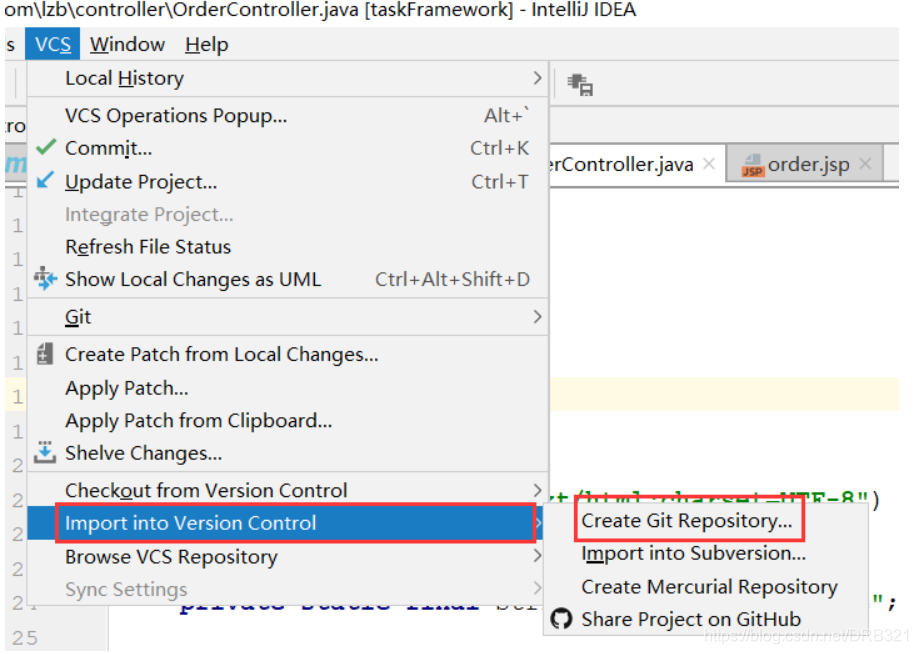 在idea的菜单项选择 VCS》Import into Version Control》Create Git Repository