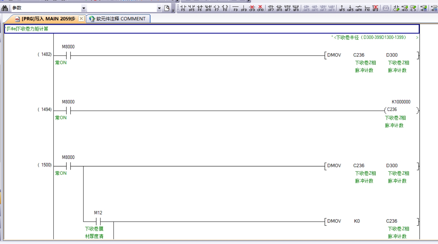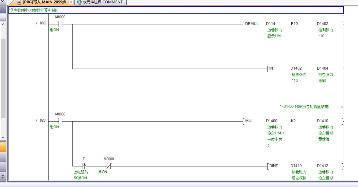 在PLC上电的瞬间(M8002为上电脉冲),我们将用于存储张力设定值的寄存器D0和存储当前张力值的寄存器D1清零,为后续的运行做好准备。
