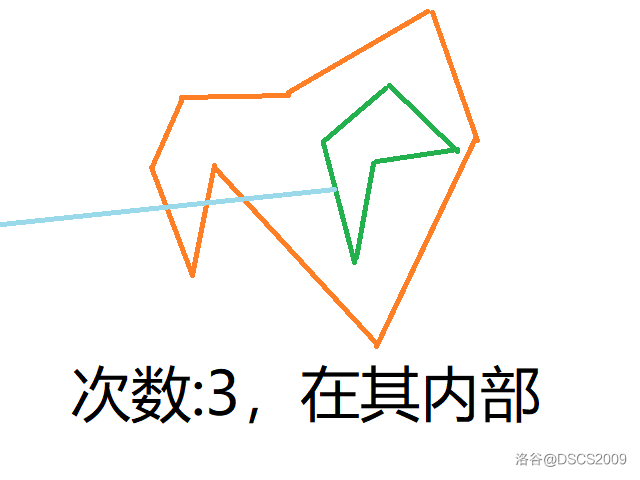 2.如果一条直线向任意方向延伸出一条射线,则如果与另一多边形的交点个数为奇数则一个在另一个里边(如果刚好交点在顶点,则要去掉一次,不然就会多一次)