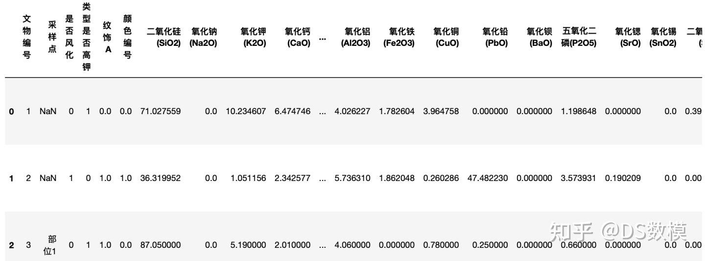 columns = ['文物编号','采样点','是否风化','类型是否高钾','纹饰A','颜色编号']