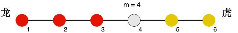下面图2为n=6,m=4的示例,其中红色为龙方,黄色为虎方: