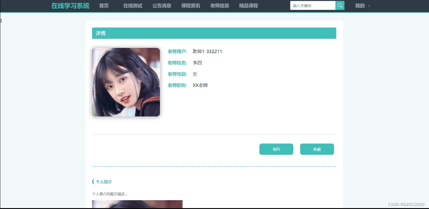 (5)老师信息:在首页导航栏上我们会看到“老师信息”这一菜单,我们点击进入进去以后,会看到所有管理员在后台发布的老师信息,我们选择想要了解老师信息,可以预约+收藏;