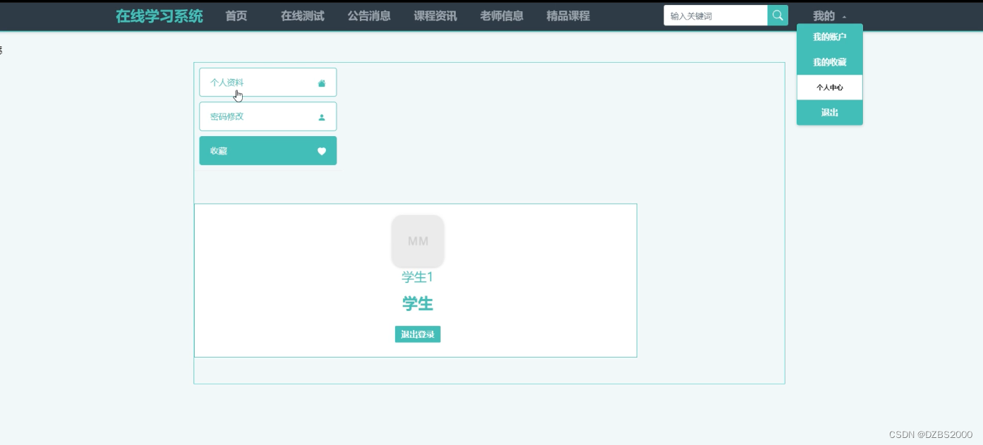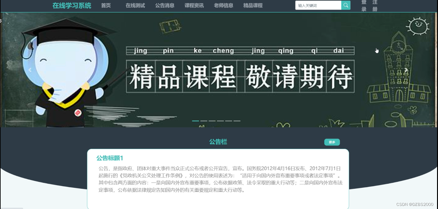 (2)查看在线学习系统的首页信息:在线学习系统的首页信息包含了首页、公告消息、在线测试、课程资讯、老师信息、精品课程等。