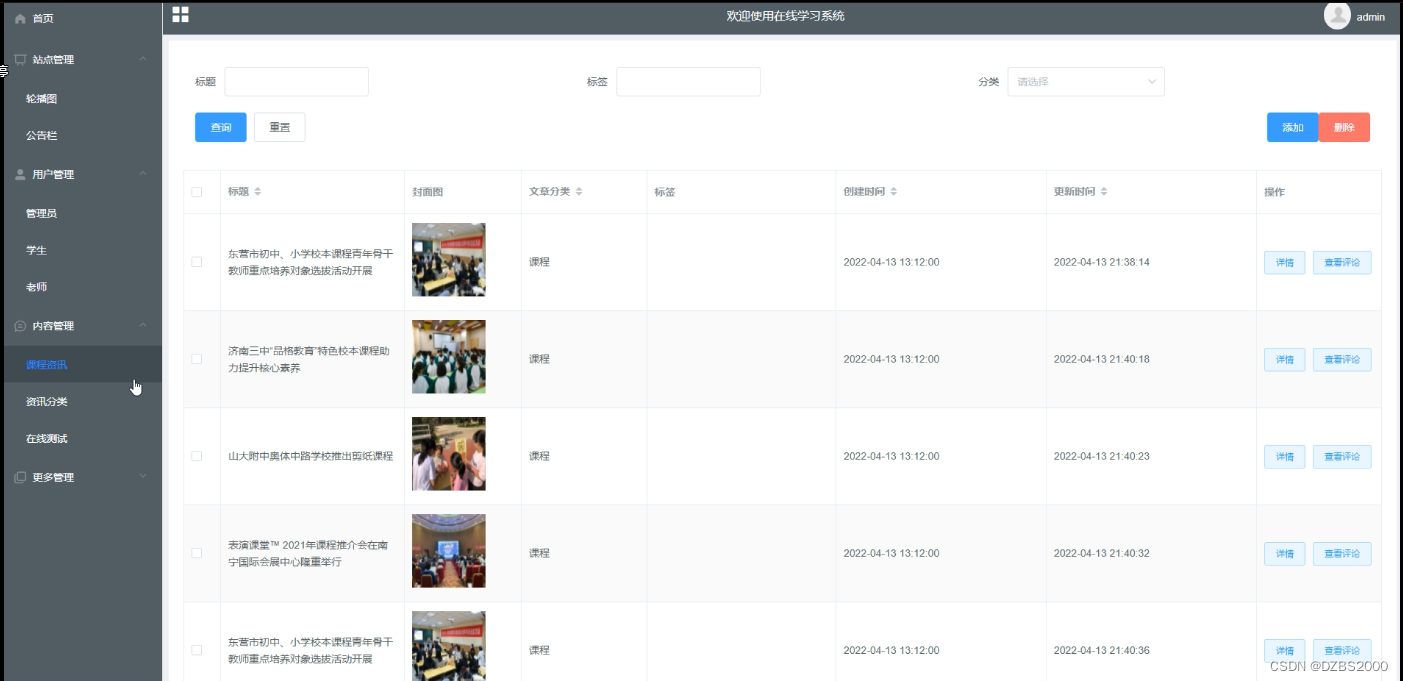 (4)内容管理:当点击“内容管理”这一菜单的时候,会出现课程资讯+资讯分类+在线测试这三个子菜单,能够对用户在前台提交的课程资讯进行管理,同时对前台展示的课程资讯分类信息进行增删改查操作;
