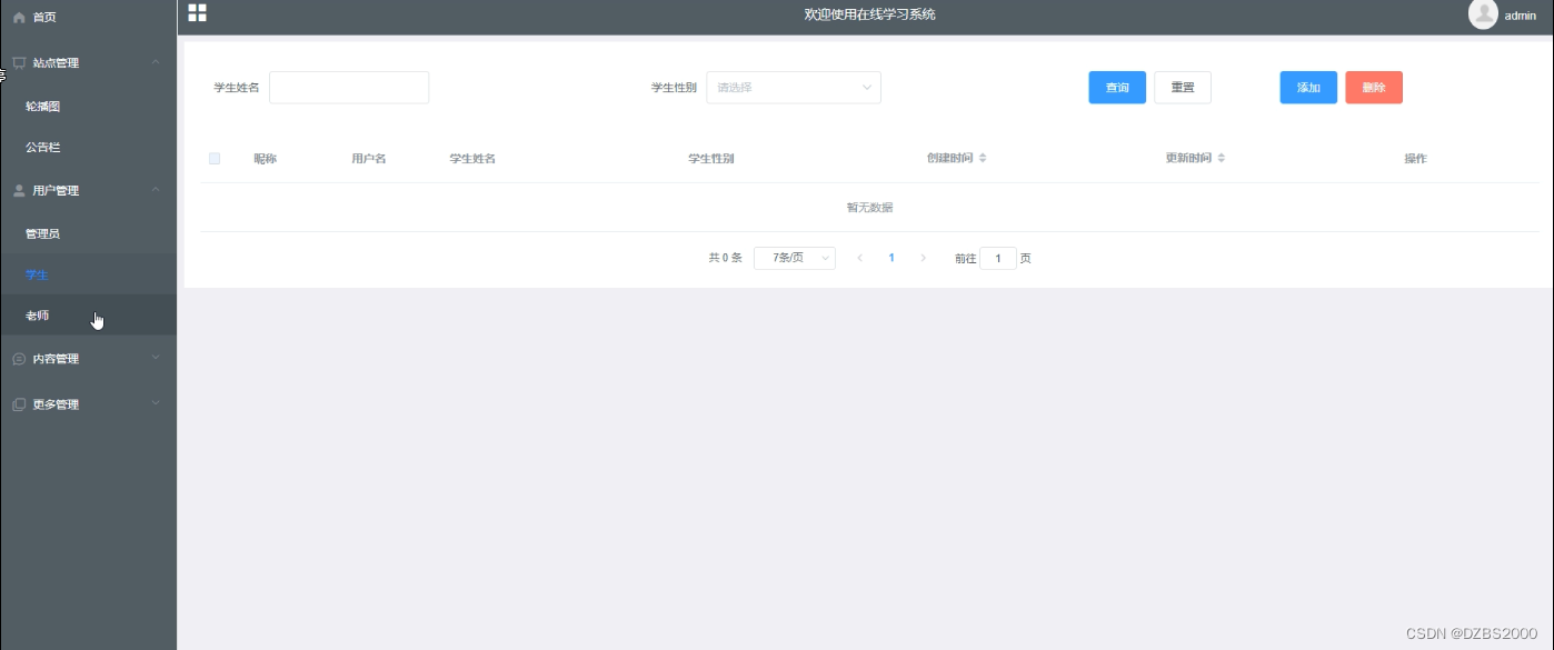 (3)用户管理:当点击“用户管理”这一菜单的时候,会出现管理员+学生+老师这三个子菜单,可以对这三个模块进行增删改查操作;