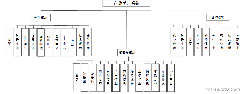 按照在线学习系统 的角色,我划分为了学生、老师管理模块和管理员管理模块这三大部分。