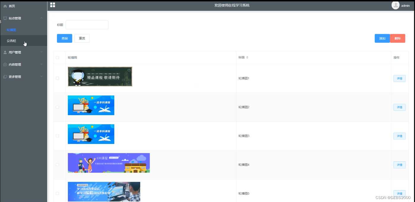 在线学习系统中的管理人员在“站点管理”这一菜单中是可以对前台显示的轮播图以及公告栏进行管控。界面如下图4-8所示。