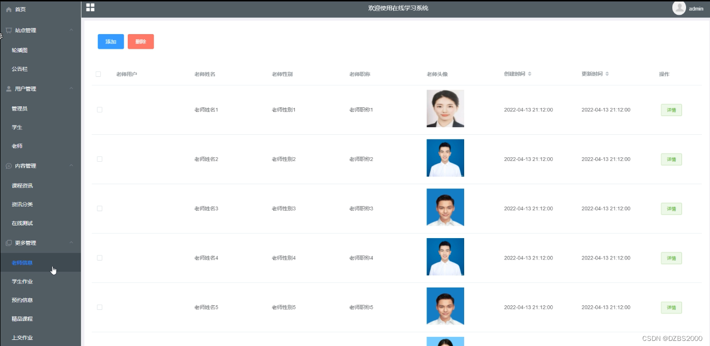 (5)更多管理:当点击“更多”这一菜单的时候,会出现老师信息+学生作业+预约信息+精品课程+上交作业这五个子菜单,能够对老师信息、精品课程管理进行增删改查操作,对学生/老师提交的上交作业、学生作业进行管控,以及实现对学生/老师提交的预约信息进行审核管理;