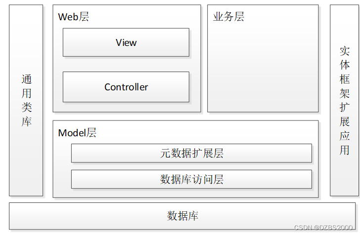 志愿者招募系统的架构设计主要分为可以3层,主要有Web层,业务层,Model层。其中web层还包括View层和Controller层,Model层包括元数据扩展层和数据访问层。