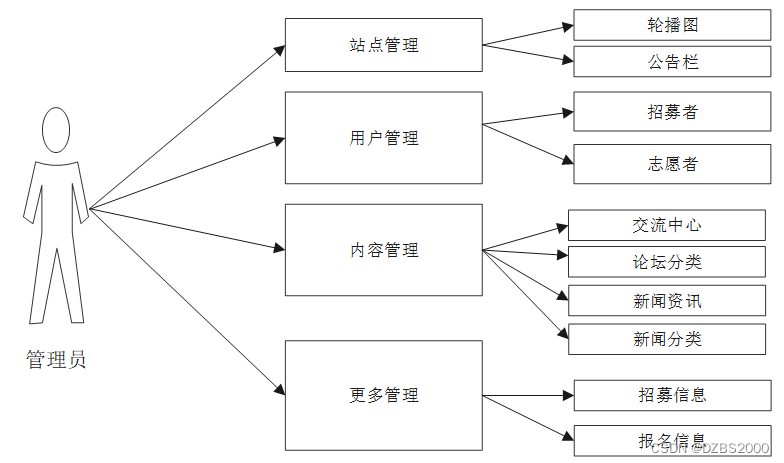 志愿者招募系统的功能主要分为前台用户根据自己的需求进行注册登录,浏览报名信息信息并对选中的报名信息进行报名操作。后台系统管理员因职责的不同,分为普通管理员和超级管理员,管理员主要对注册用户,公告栏,招募信息进行处理。