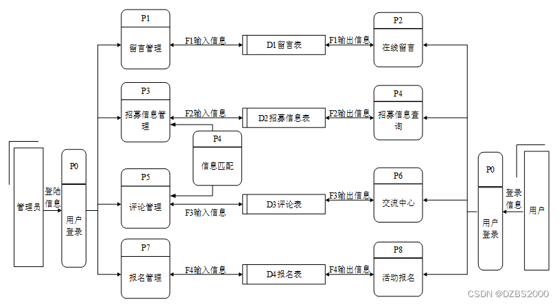 对系统的数据流进行分析,系统的使用者分为二类,一般用户,管理员。系统主要对界面信息传送,登录信息的验证,注册信息的接收,用户各种操作的响应做处理。