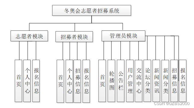 志愿者招募系统总体分为前台用户模块和后台管理员模块。