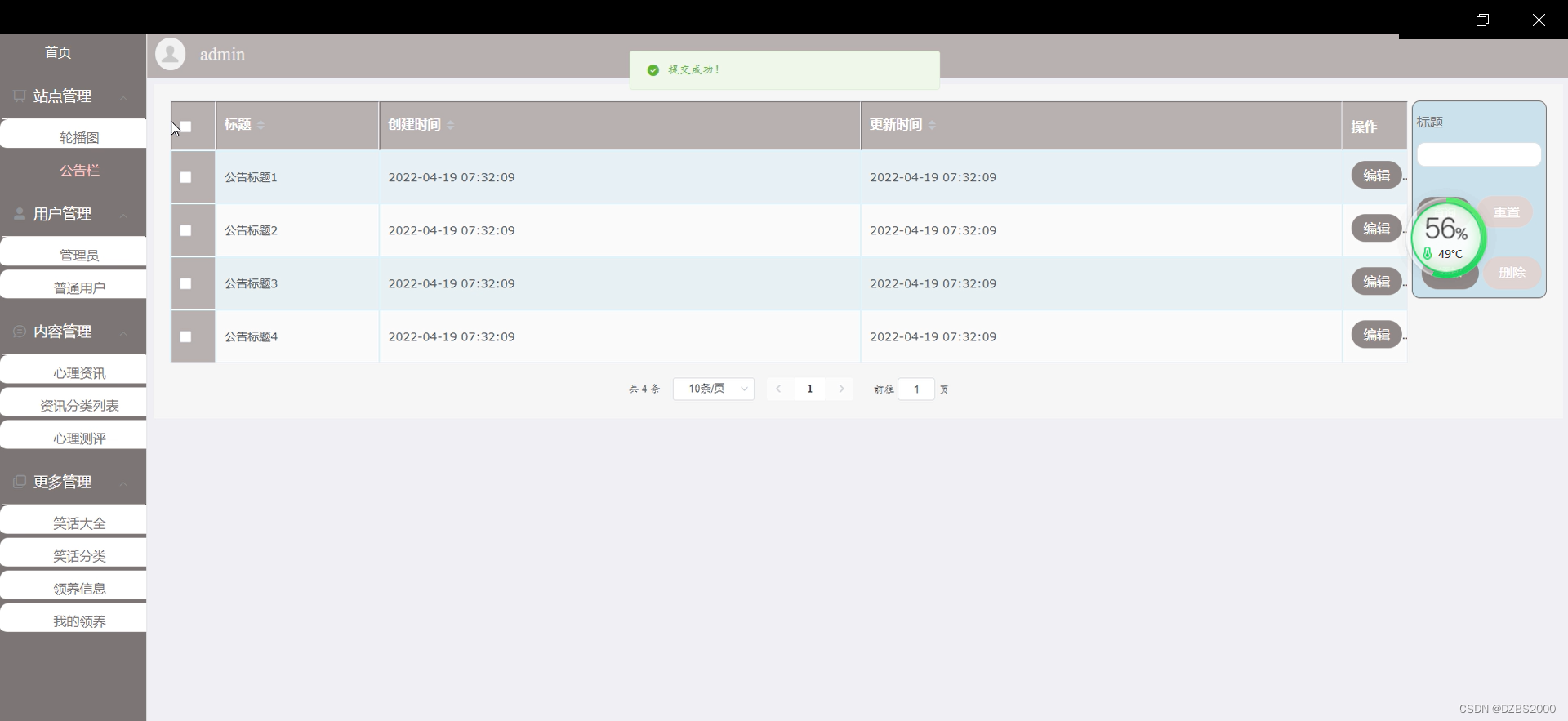 在管理员功能页面可以查看管理员:站点管理(轮播图、公告栏)用户管理(管理员、普通用户)内容管理(心理资讯、资讯分类列表、心理测评)更多管理(笑话大全、笑话分类、领养信息、我的领养)等内容进行相对应操作,如图5-9所示。
