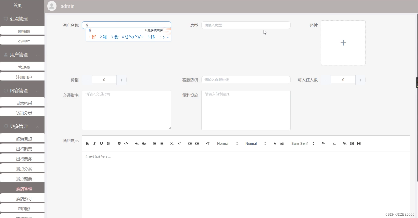 酒店管理模块:酒店管理分为美食添加、修改和酒店预订。酒店信息由管理员进行修改、添加、删除操作;酒店预订由普通用户来执行。