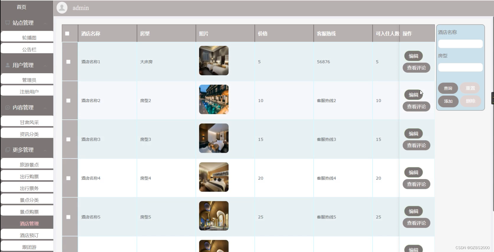 管理员点击左侧菜单“酒店信息管理”,页面跳转到酒店信息管理外观,调用后台景点查询所有酒店信息。并将信息密封到数据集合List,绑定到请求对象,然后页面跳转到相应的Java页面,显示出酒店信息,单击删除按钮完成酒店信息的删除。