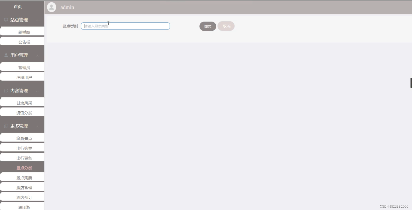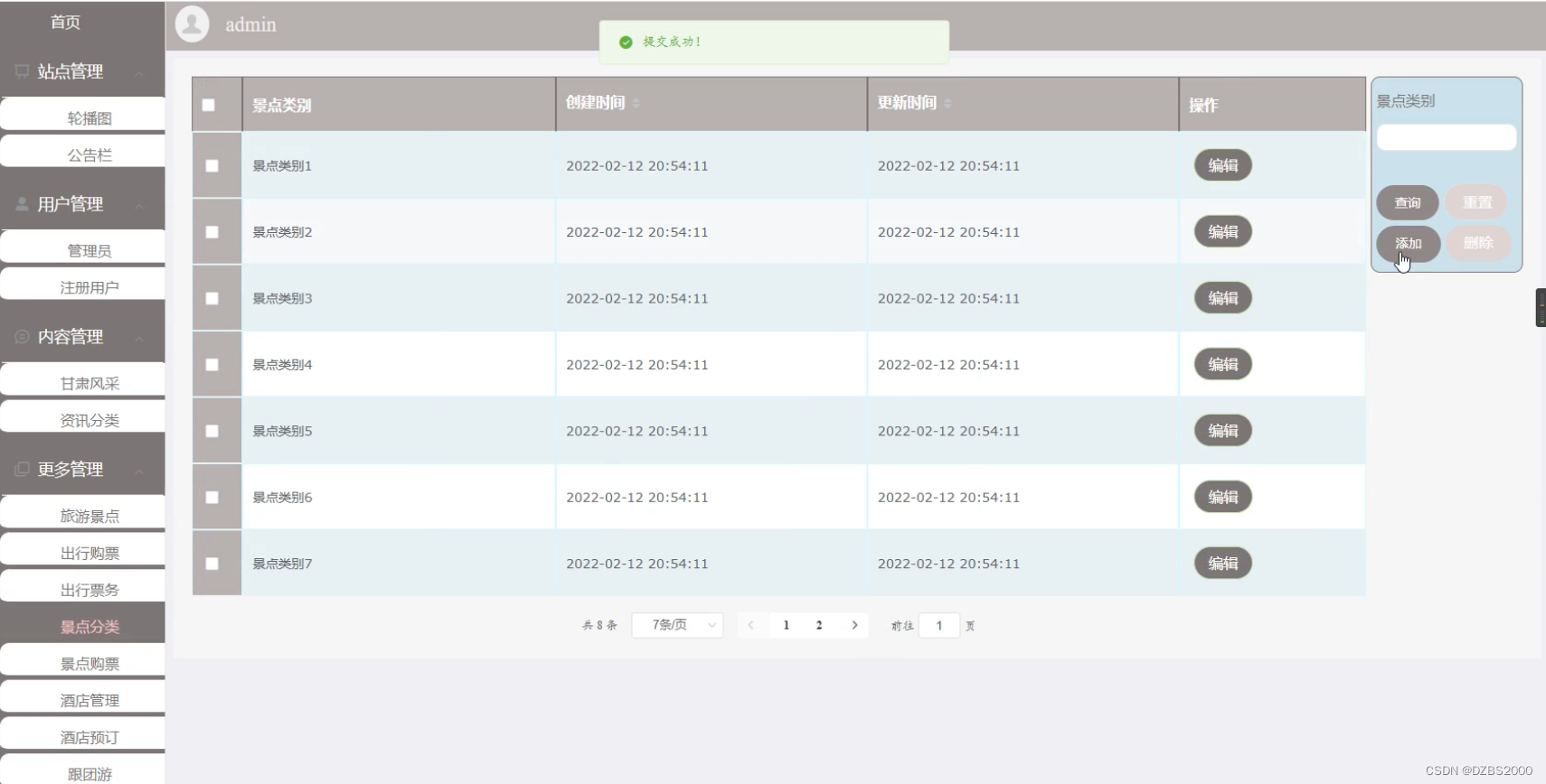 添加景点分类时,会给出数据填写的页面,该页面根据填写好的景点分类编号同样会事先发送Ajax请求查询编号是否已存在,数据填写好之后提交到后台,会调用相关服务在数据库中插入记录。