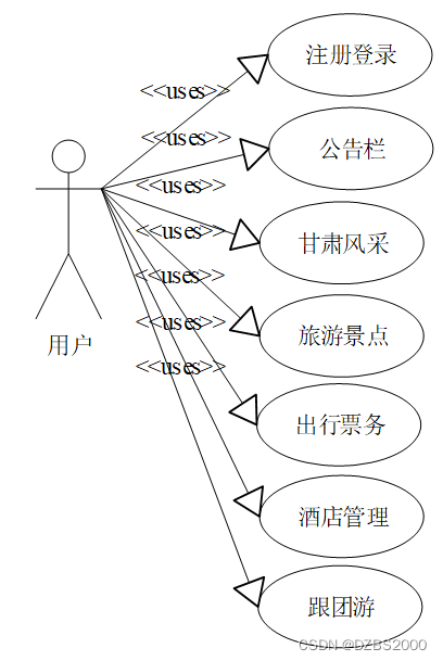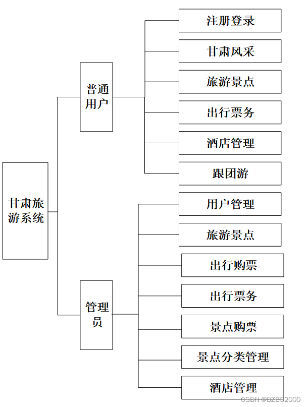 甘肃旅游系统的功能主要分为前台用户根据自己的需求进行注册登录,浏览景点信息并对选中的景点进行购票操作。后台系统管理员因职责的不同,分为普通管理员和超级管理员,普通管理员主要对购票单进行处理,发布旅游景点,而超级管理员主要对注册用户,景点详细信息,购票信息进行管理维护。