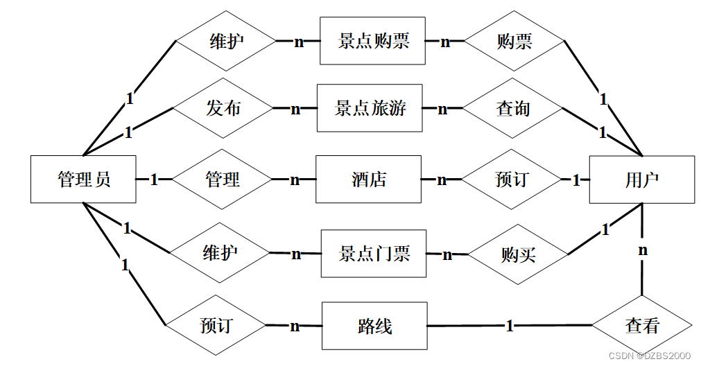 从前面可以分析到数据库中最重要的是景点信息,注册用户信息,管理员信息,同时存在路线预订信息和酒店预订信息、酒店管理信息、酒店购票信息、出行票务信息、出行购票信息、景点购票信息、旅游景点信息、路线预订信息。分析可以得到如下数据描述:
