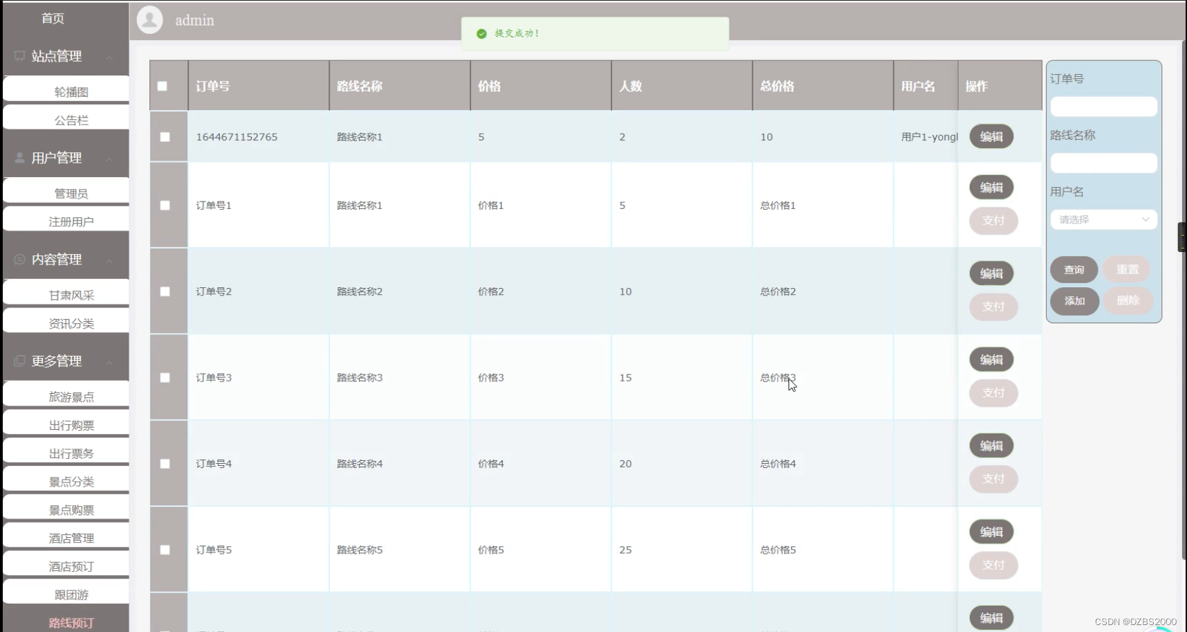 路线预订:存放给路线预订的内容,包括订单号、路线名称、价格、人数、总价格、用户名、联系电话、支付状态、支付类型等数据项。