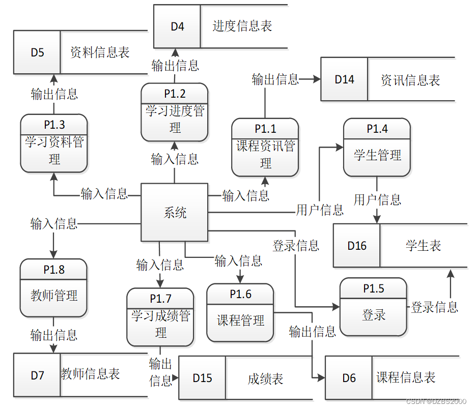 二层数据流程是对一层数据流层图中填写登录信息、用户功能的细化。即:填写登录信息细化为填制信息、后台审核,用户功能细化为用户管理、学生管理、教师管理、学习进度、学习资料、学习成绩、课程管理、课程资讯查看等操作。