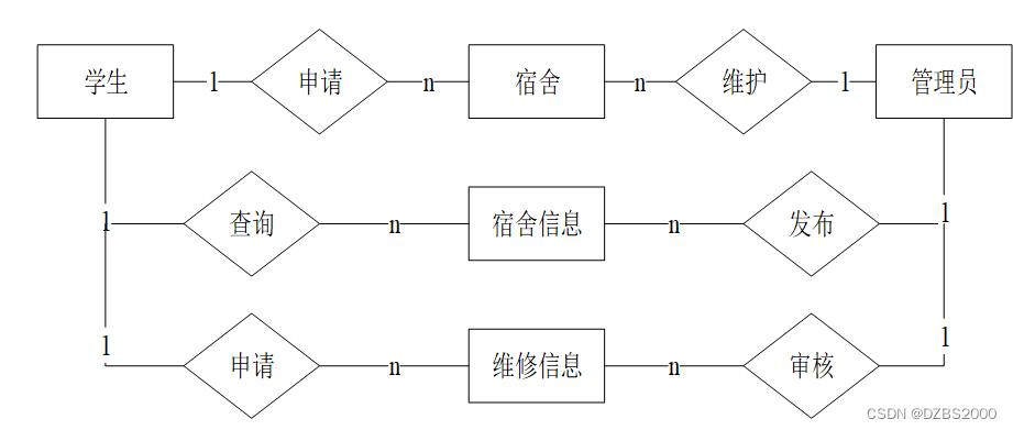 对于一个要开发的系统来说,E-R图可以让别人能更快更轻松的了解此系统的事务及它们之间的关系。根据系统分析阶段所得出的结论确定了在计算机基础自学系统 中存在着多个实体分别是用普通用户、管理员、(宿舍管理、学生管理、活动信息、违纪信息、维修信息、意见管理)系统总体ER图如下图所示。