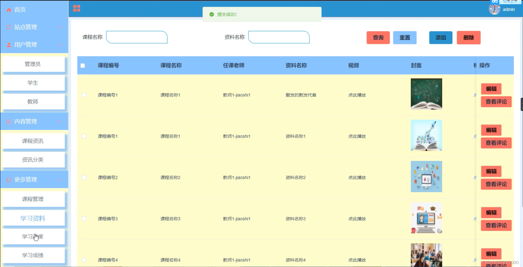 管理员点击左侧菜单“学习资料信息管理”,页面跳转到资料信息管理外观,调用后台学习查询所有学习资料信息。并将信息密封到数据集合List,绑定到请求对象,然后页面跳转到相应的jsp,显示出课程信息,单击删除按钮完成课程信息的删除。