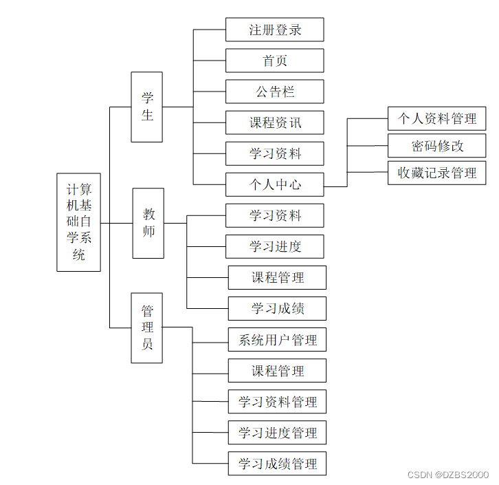 计算机基础自学系统 在对需求做解析后,整个系统主要分为三个部分:管理员、宿管人员和学生,每个模块下的分支功能不一样。对功能做出如下说明: