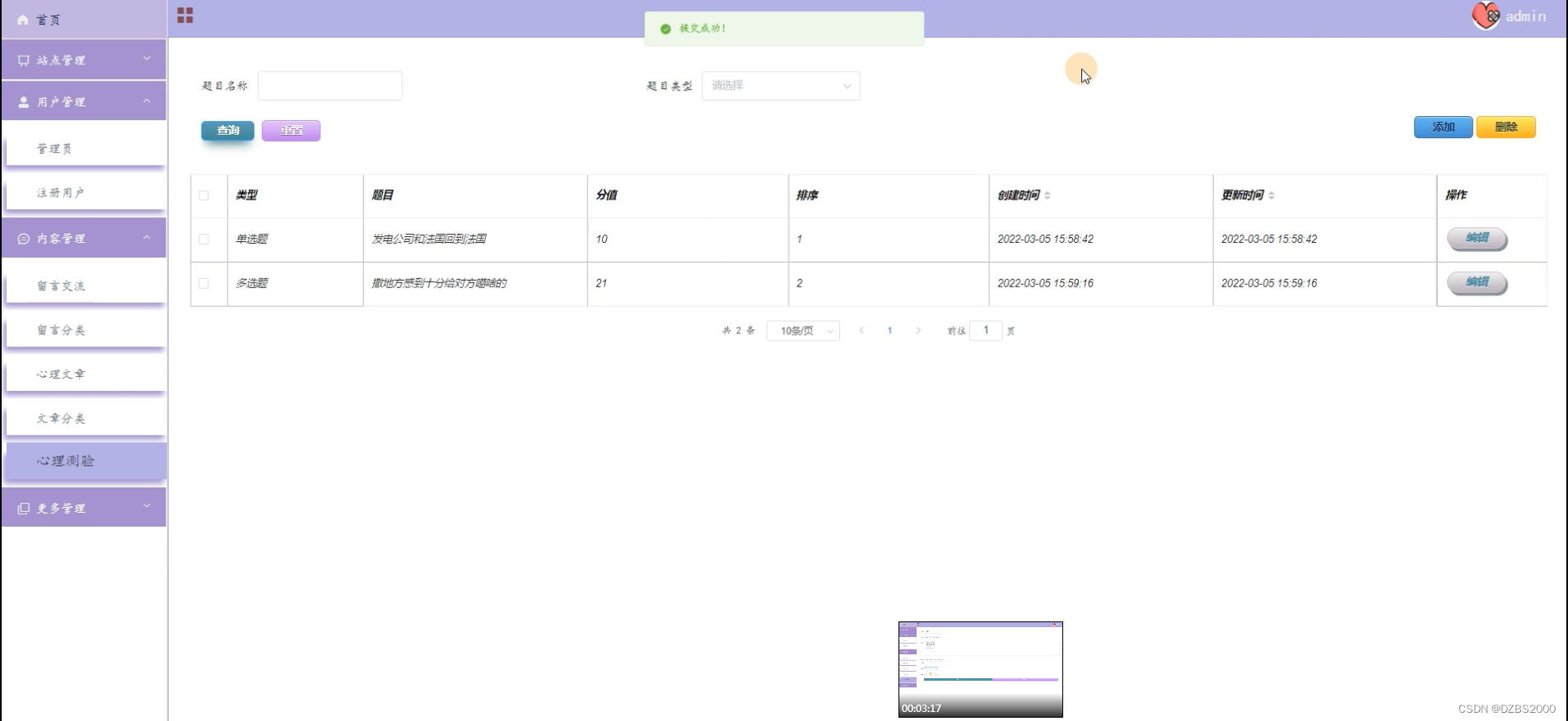 心理测验,在心理测验页面可以查看类型、题目、分值、排序等编辑信息,并可根据需要进行修改或删除操作,如图5-11所示。
