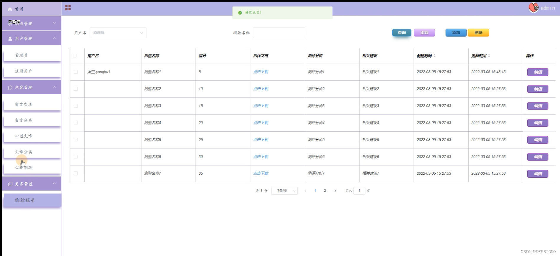 测验报告管理,在测验报告管理页面可以查看用户名、测验名称、得分、测评文档、测评分析、相关建议等信息,并可根据需要进行编辑、修改或删除操作,如图5-12所示。
