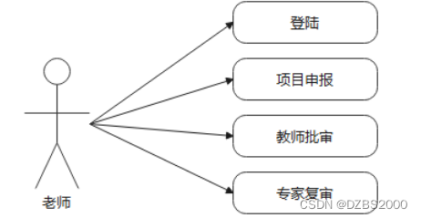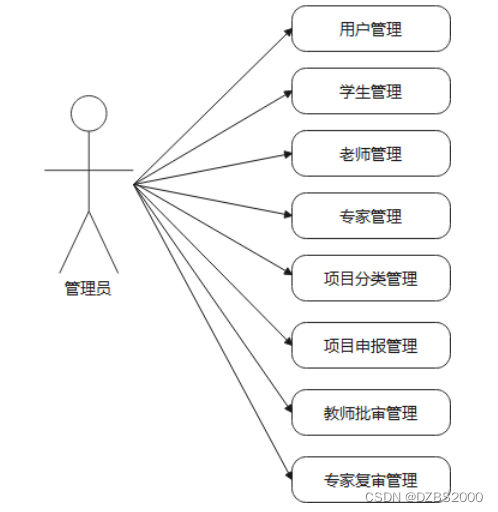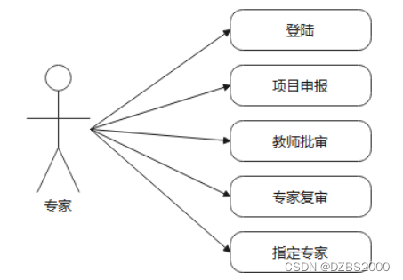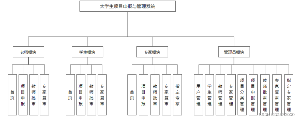 大学生项目申报管理系统在对需求做解析后,整个系统主要分为两个部分:管理员和教师、专家,每个模块下的分支功能不一样。对功能做出如下说明: