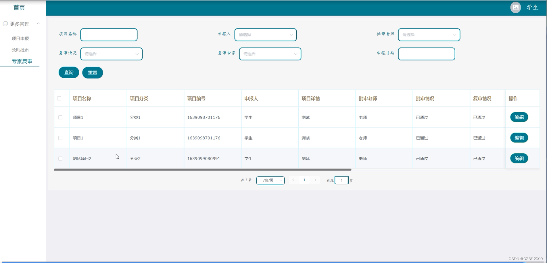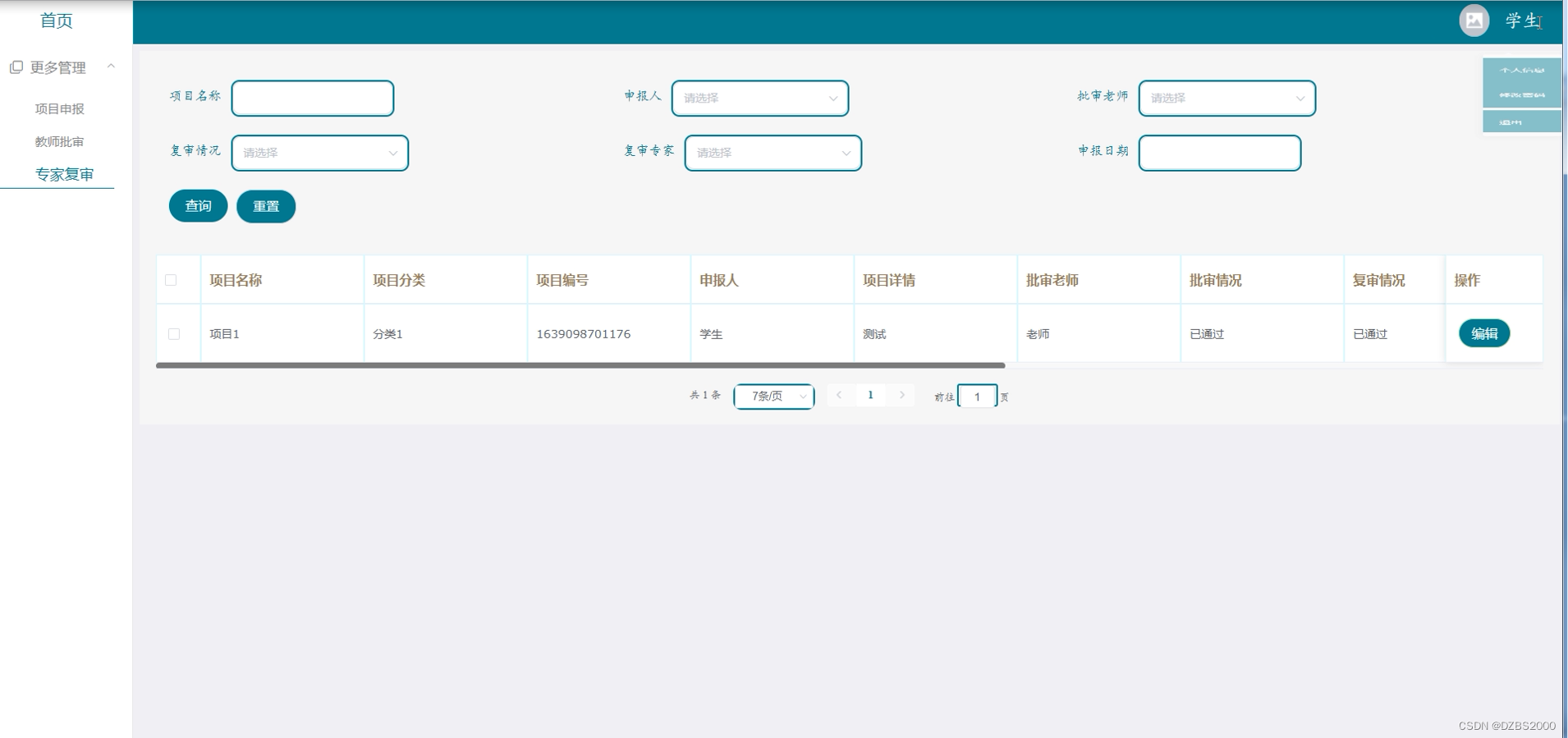 专家和学生存在审核关系,关系为一对多,根据项目编号来将项目数据传入到审核数据中,操作人为专家,然后生成审核列表,专家查看个人历史审核列表,可以进行数据销毁。