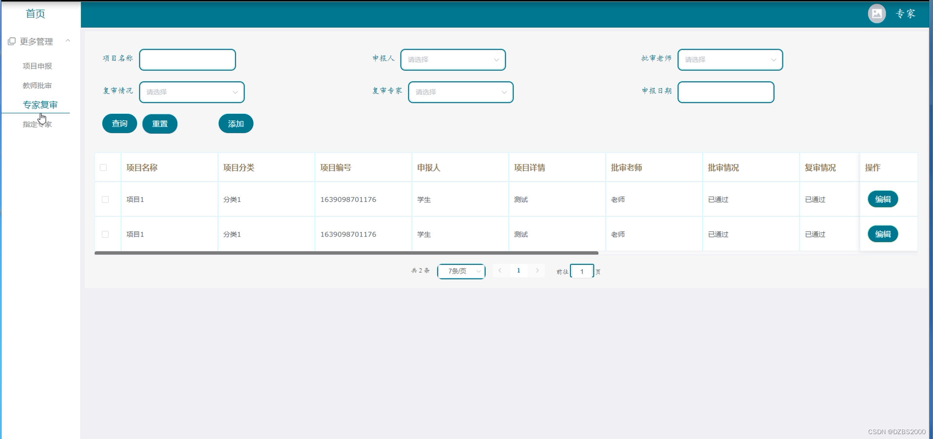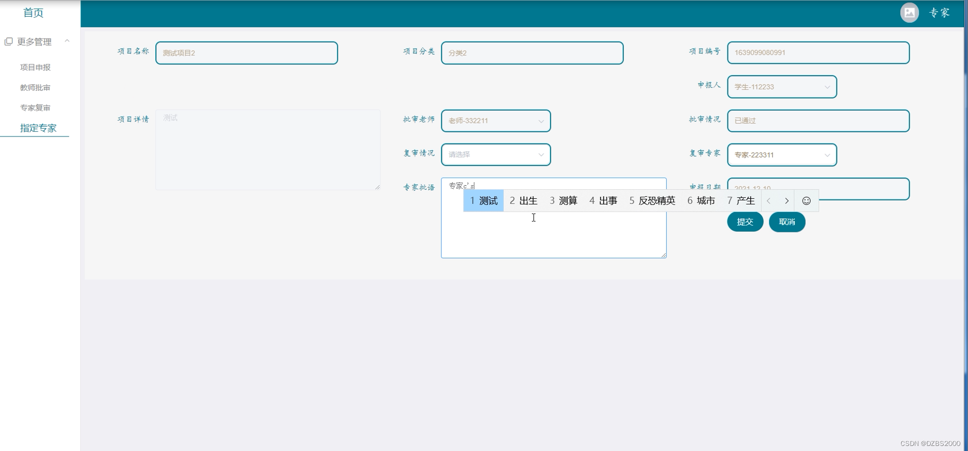 指定专家(指定专家id、项目名称、指定专家、项目编号、项目分类、批审老师、项目详情、批审情况、申报日期)