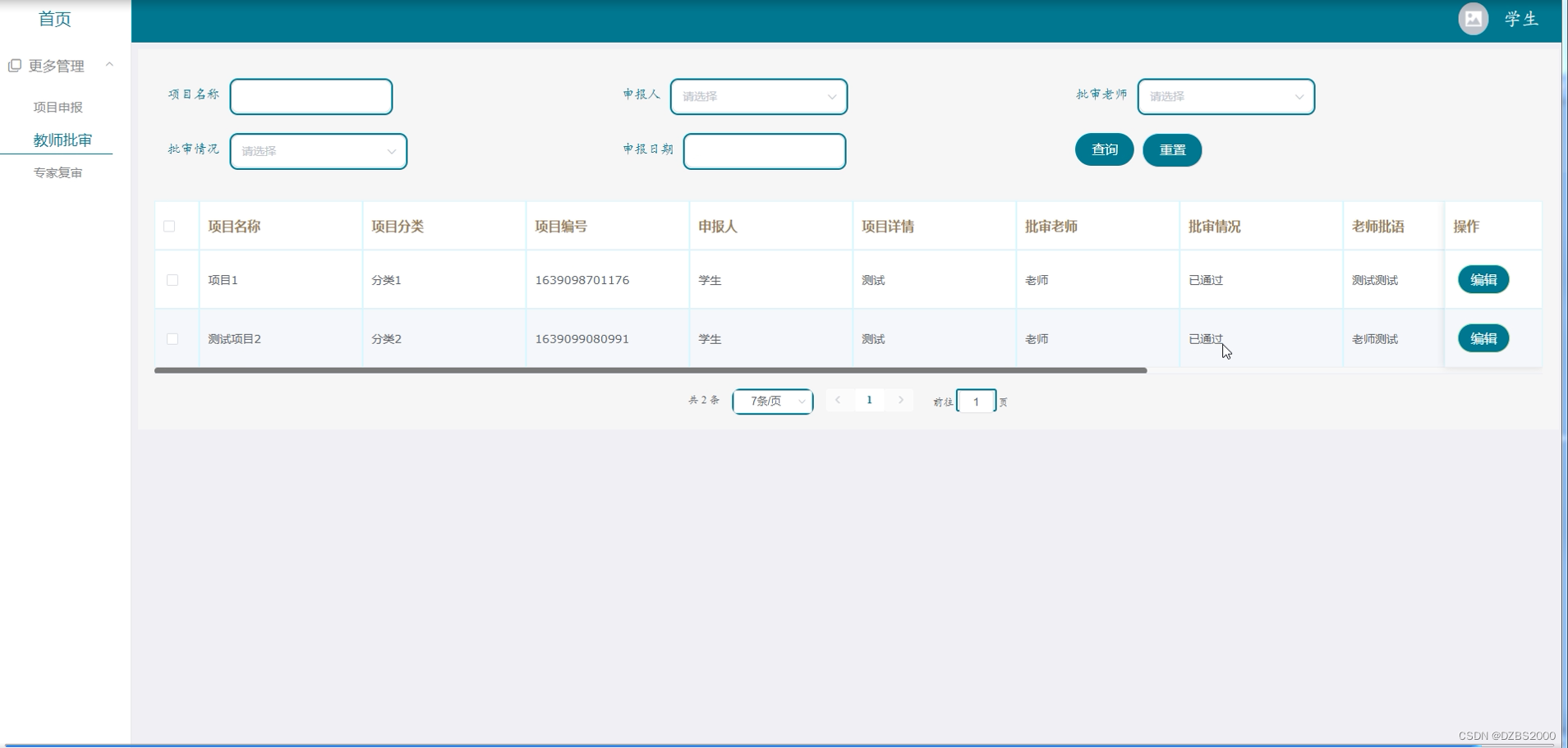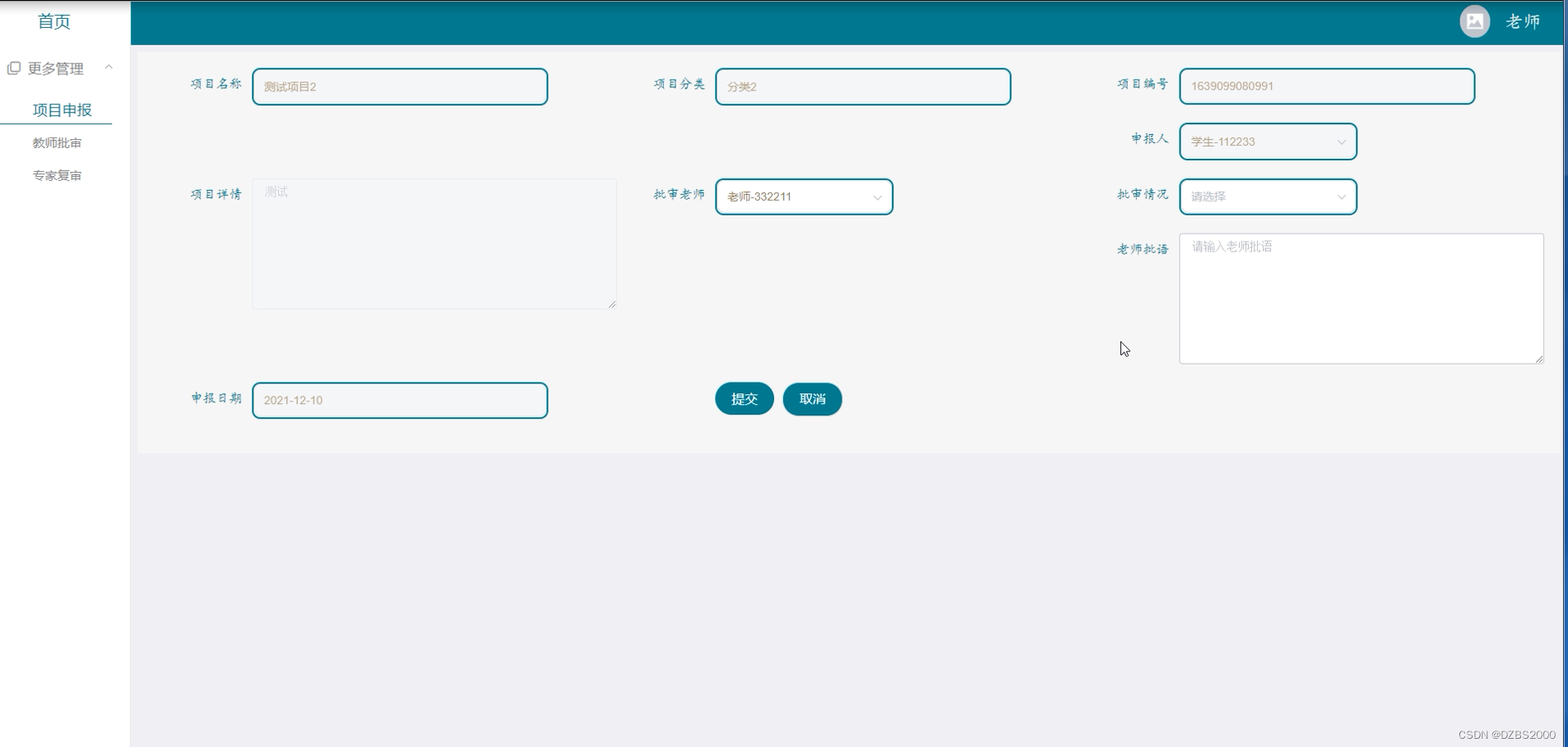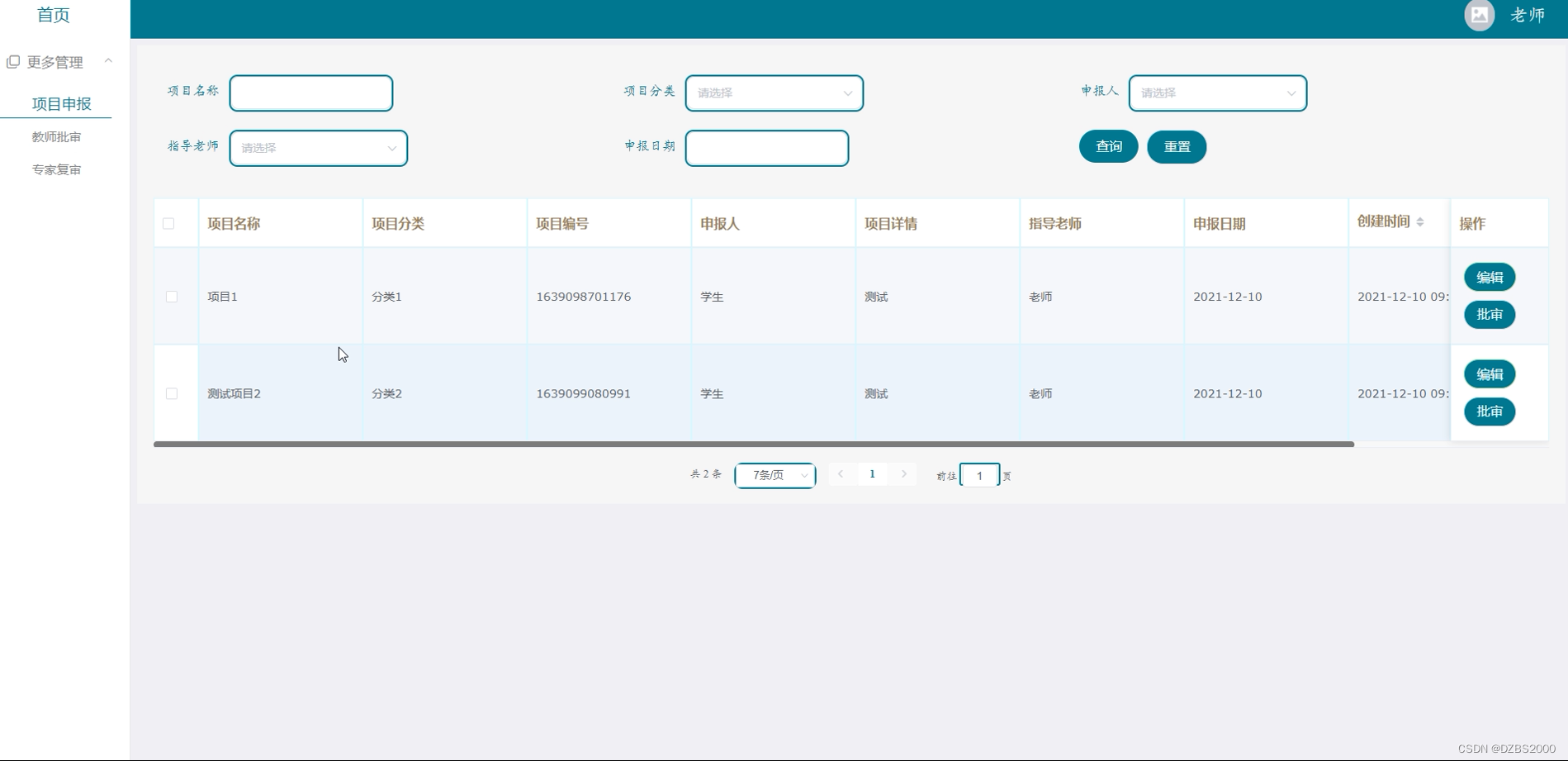 教师审批(教师审批id、项目名称、项目分类、项目编号、申报人、项目详情、批审教师、批审情况、老师批语)