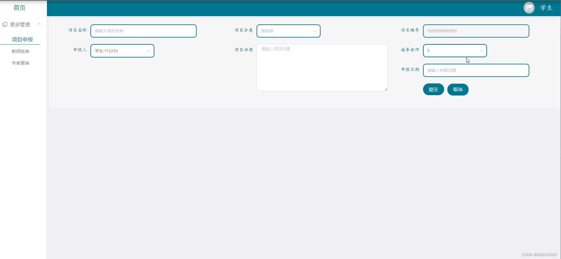 项目申报(项目申报id、申报人姓名、项目名称、项目编号、项目详情题、指导老师、申报日期)