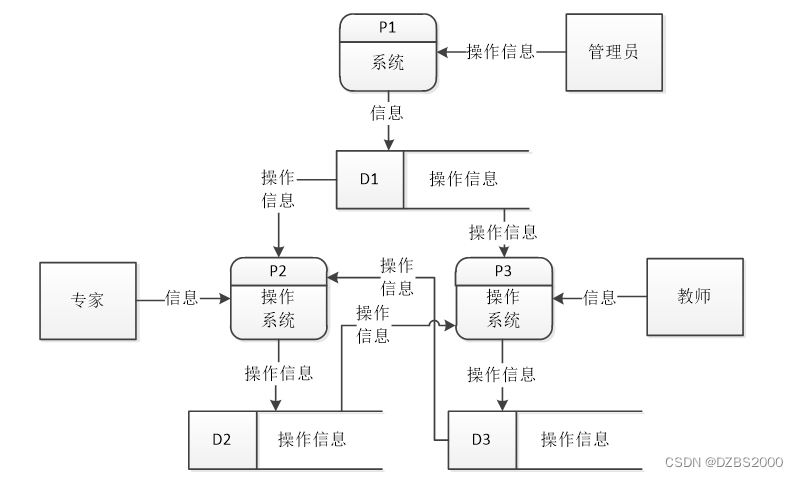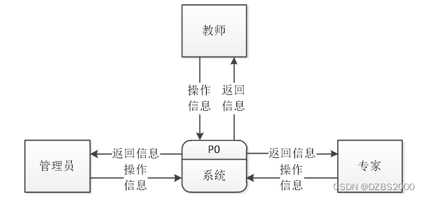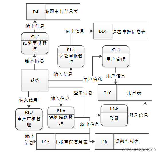 二层数据流程是对一层数据流层图中填写登录信息、用户功能的细化。即:填写登录信息细化为填制信息、后台审核,用户功能细化为申报人、项目名称、项目分类、指定专家、项目编号、批审老师、项目详情、批审情况等操作。