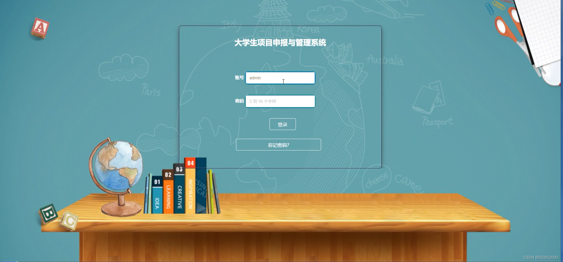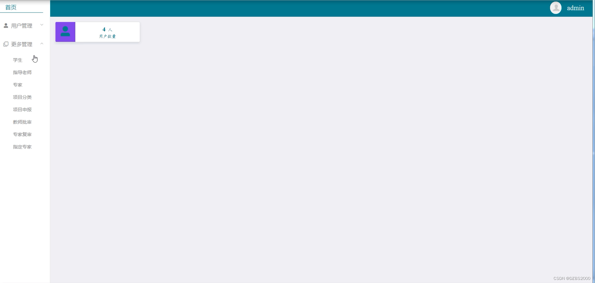 管理员主界面:管理员用户在登录主界面正确填写用户名、密码后即可进入管理员账户界面。由管理员账户对学生账户,教师账户、专家账户以及项目申报做增、删、改、查。同时也可以指定项目申报由哪些专家评审。