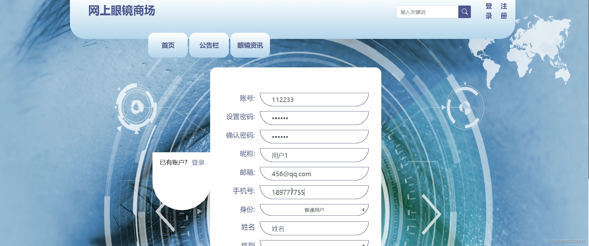 注册成功后,用户可以通过输入用户名来登录系统,输入密码后进行验证。登录成功后,用户可以使用眼镜收藏、眼镜购买、查看我的订单、眼镜资讯、个人信息管理等功能。