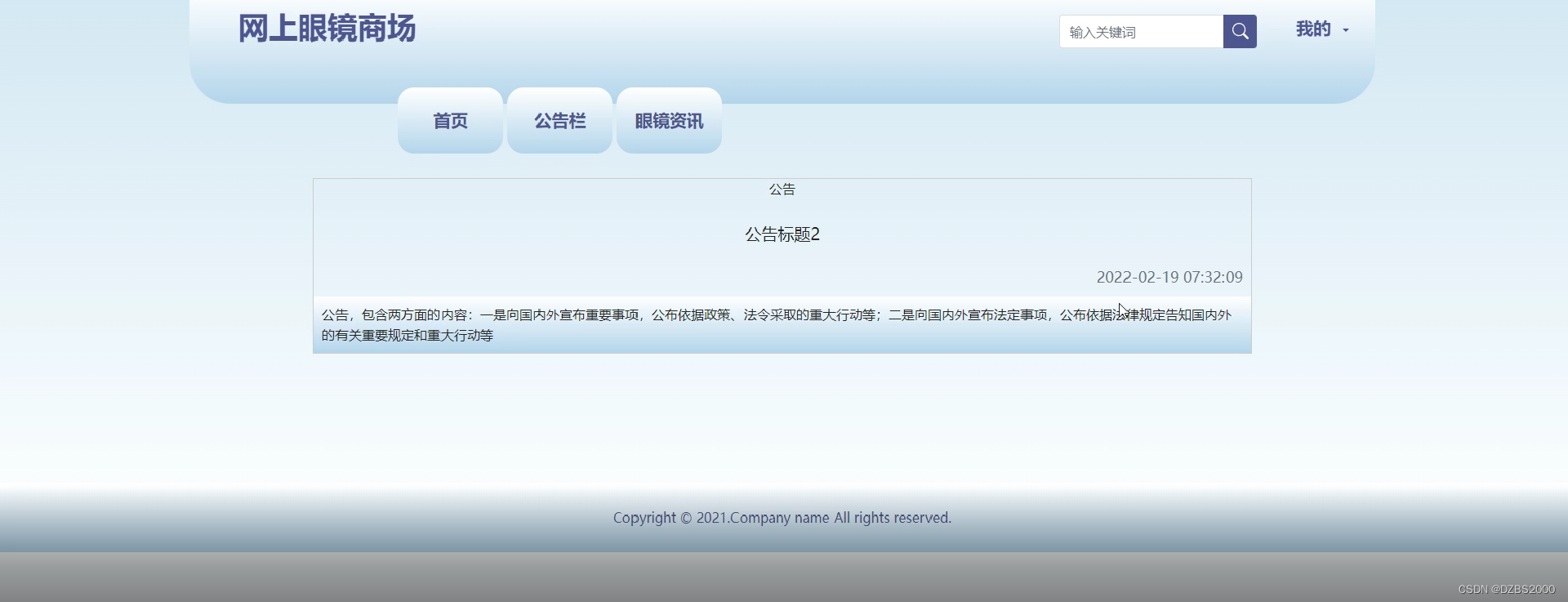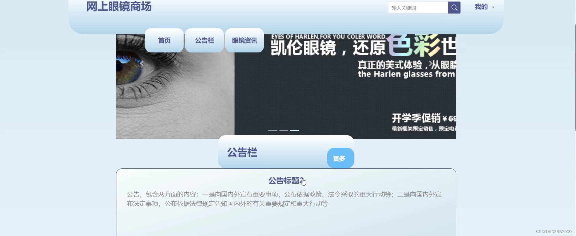系统首页展示了眼镜搜索输入框,用户在输入框内输入与眼镜类型相关的关键字,系统通过模糊查询搜索到用户需要的眼镜并展示。