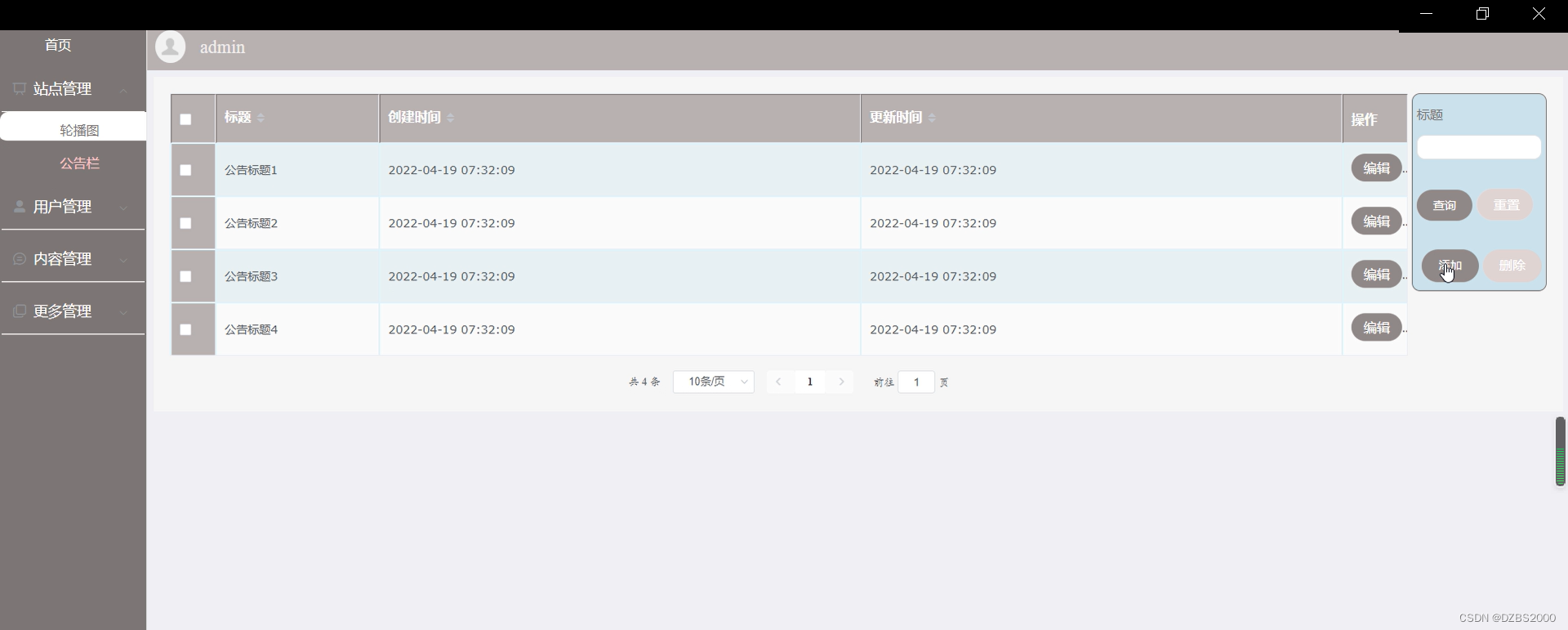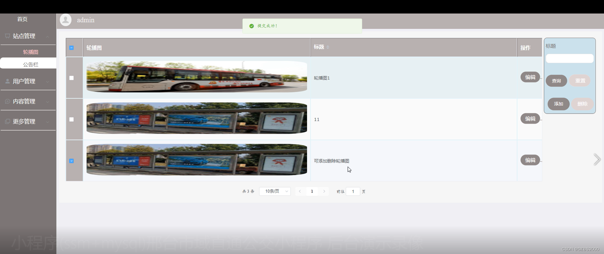 轮播图展示,管理员通过输入标题、内容、链接、轮播图、点击量等操作提交,如图5-6所示。