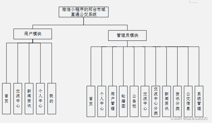 基于微信小程序的邢台市域直通公交系统基于现有的手机,可以实现管理员,首页、站点管理(轮播图、公告栏)用户管理(管理员、普通用户)内容管理(交流中心、交流中心分类、新闻资讯、资讯分类)更多管理(公交信息)等详细的了解及统计分析。根据系统功能需求建立的模块关系图如下图: