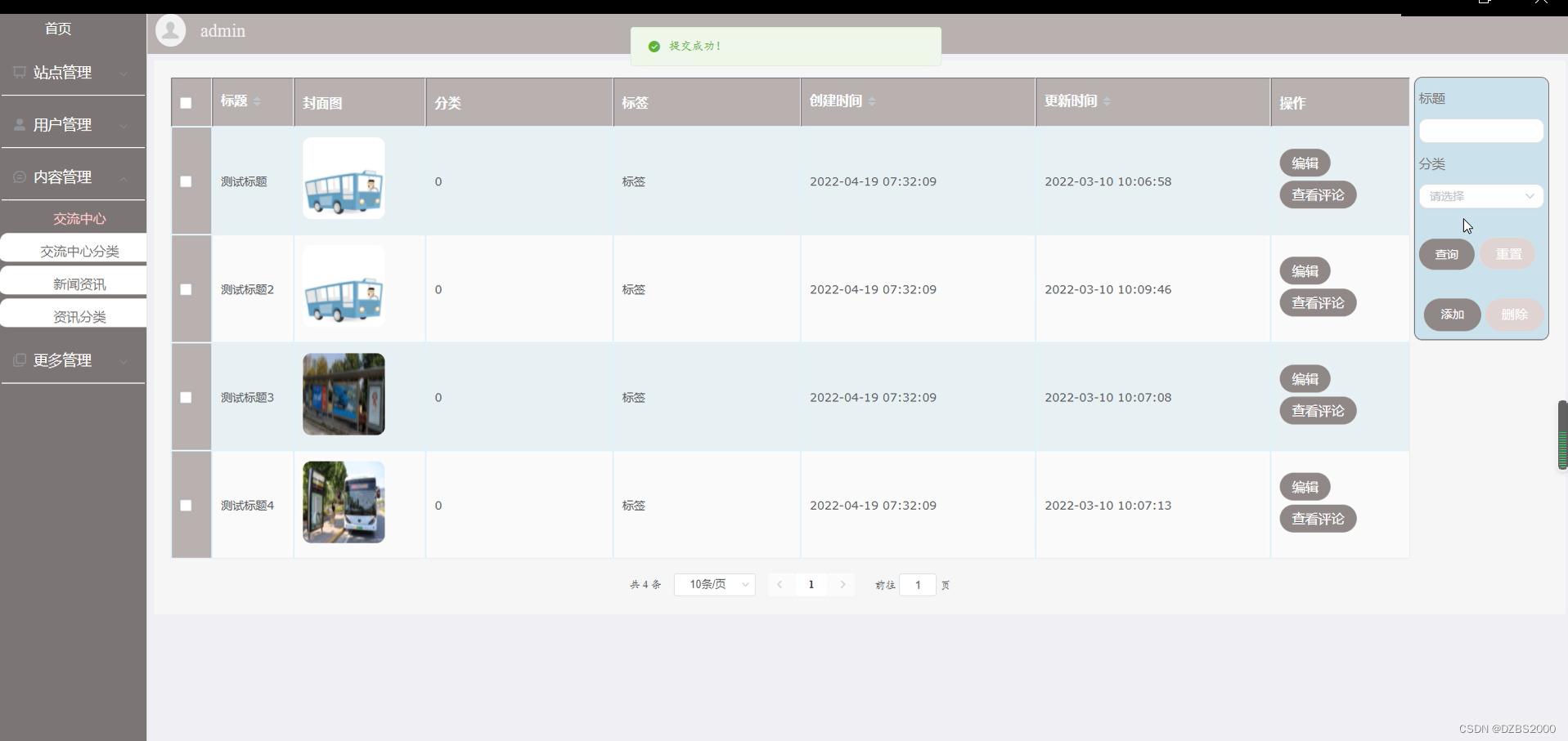交流中心,在交流中心页面可以查看标题、封面图、分类、标签等内容,并可根据需要进行修改或删除操作,如图5-9所示。