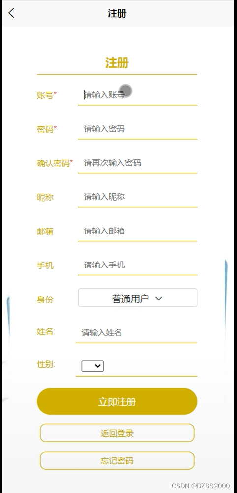 注册,通过填写账号、密码、昵称、手机、、邮箱、简介等信息,输入完成后选择提交即可注册成功,如图5-2所示。