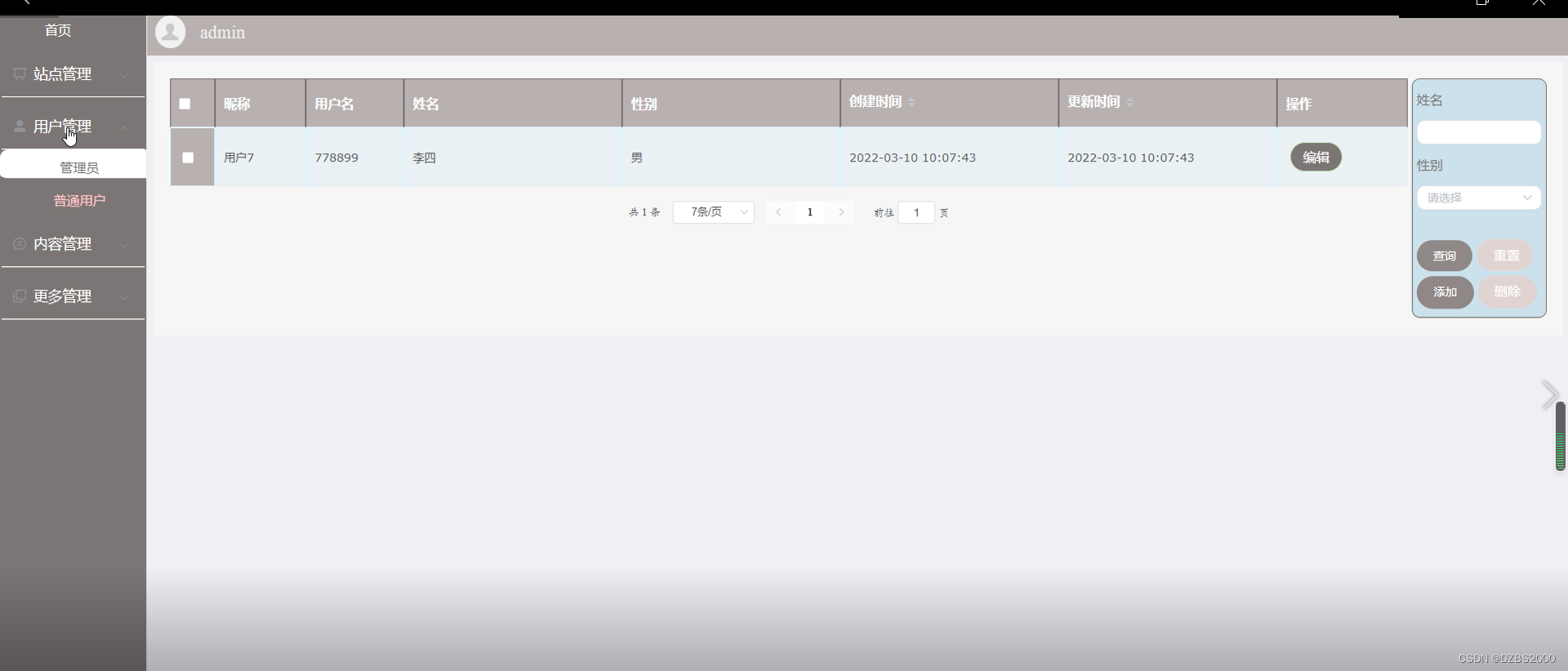 用户管理,在用户管理页面可以编辑用户昵称、用户名、姓名、性别、等内容,并可根据需要进行修改或删除操作,如图5-8所示。