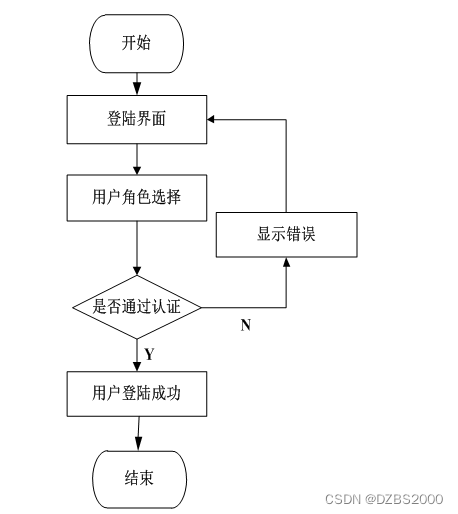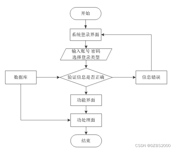 用户想进入系统,首先进入系统登录界面,通过正确的用户名、密码,选择登录类型登录,系统会检查登录信息,信息正确,然后输入相应的功能界面,提示信息错误,登录失败。系统操作流程如图3-4所示。