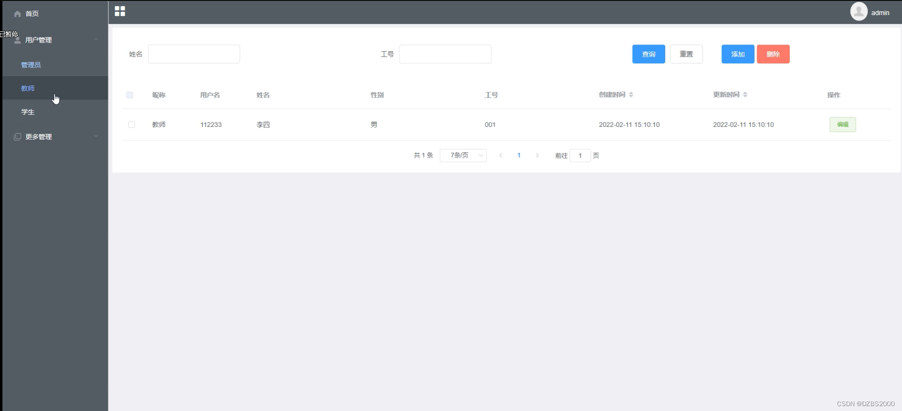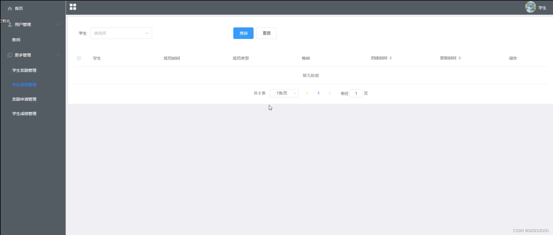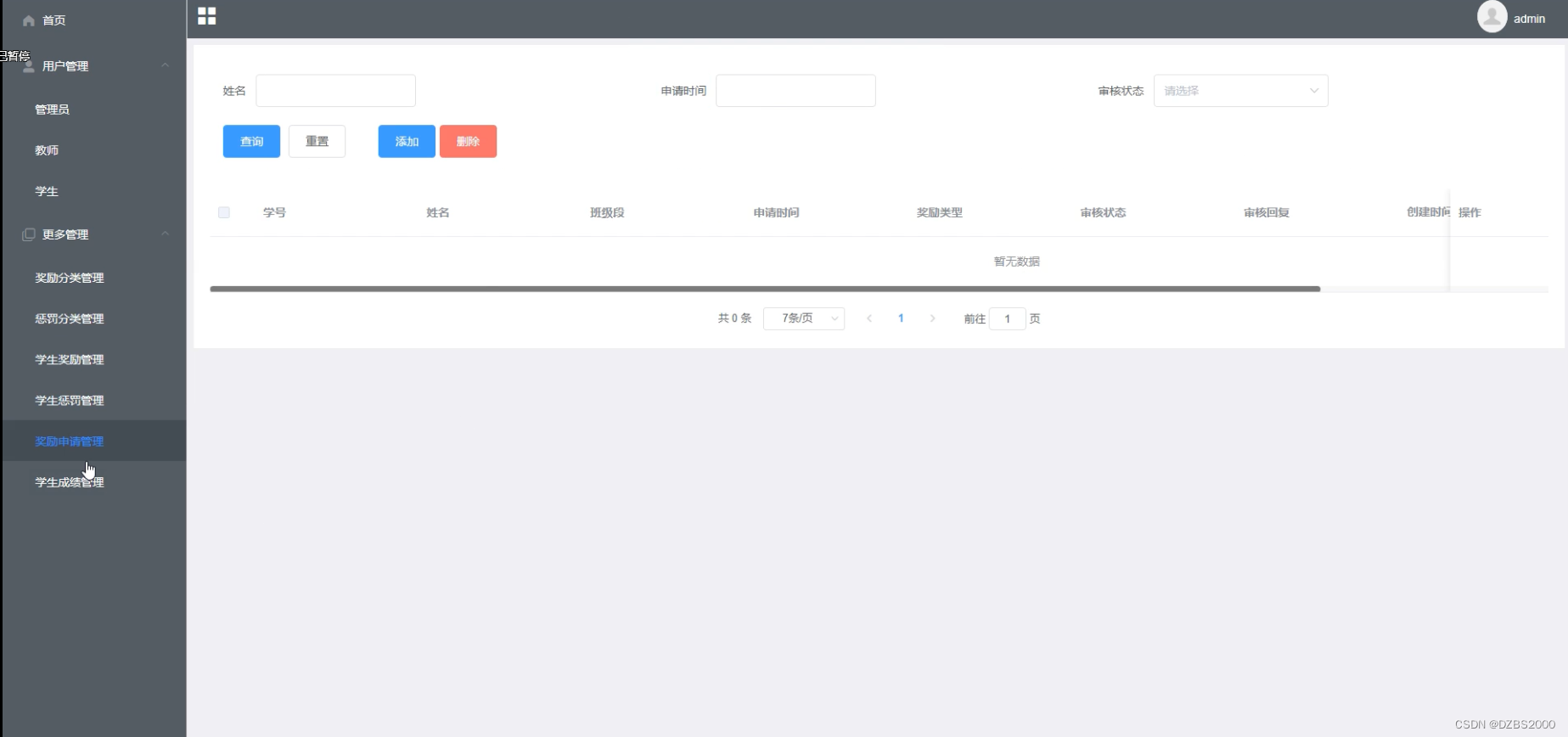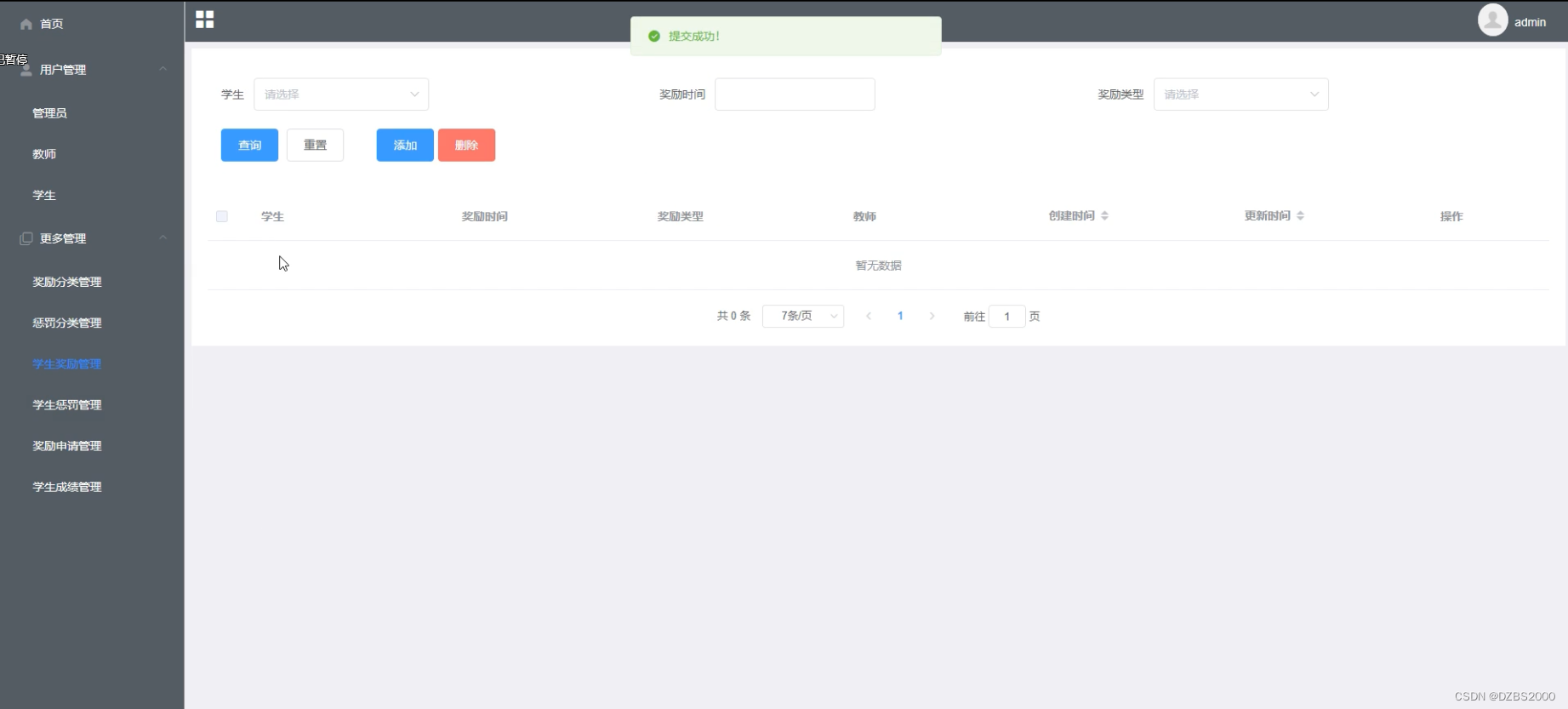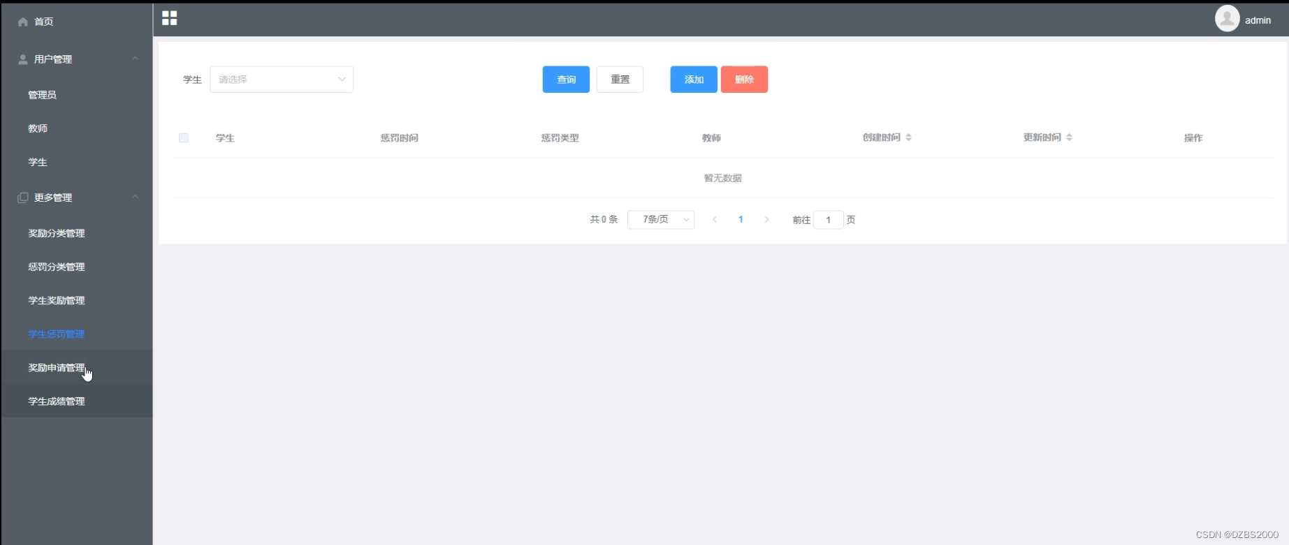 管理员;在管理员页面中可以查看首页、用户管理(管理员、教师、学生)更多管理(奖励分类管理、惩罚分类管理、学生奖励管理、学生惩罚管理、奖励申请管理、学生成绩管理)系统管理等信息,如图5-7所示。